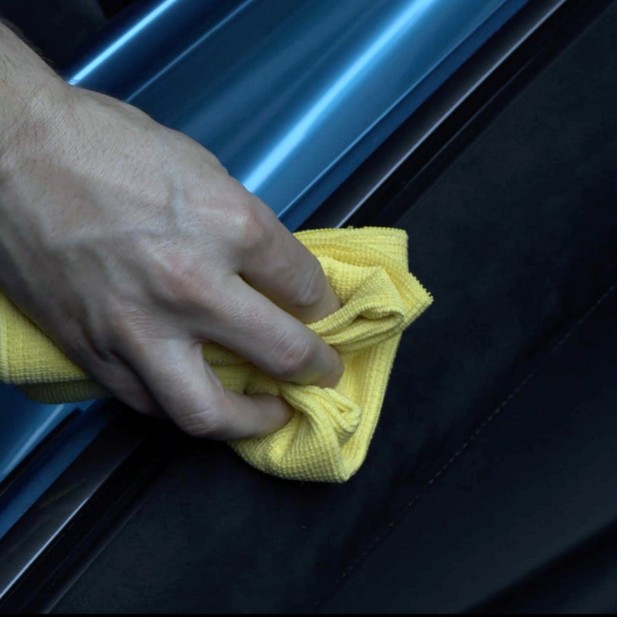 3. Swissvax Quick Interior Finish auf ein sauberes Swissvax Micro-Wash Mikrofasertuch (gelb) aufsprühen und gleichmässig verteilen.