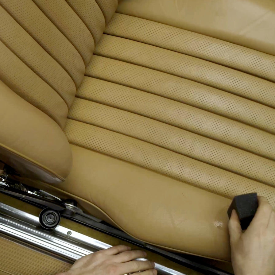 Le durcissement peut être partiellement inversé, mais un cuir rétréci reste rétréci. C'est particulièrement une mauvaise nouvelle pour les tableaux de bord difficiles à démonter. Cependant, ces cuirs rétrécis doivent toujours être traités avec Leather Softener pour protéger le cuir de la dégradation et le rendre plus résistant. Les cuirs durcis sont humidifiés autant que possible avec Leather Softener. Pour les cuirs avec une surface très lisse et fermée, traitez d'abord avec notre tampon de ponçage pour cuir pour obtenir une meilleure absorption du ramollisseur. Le ramollisseur est une huile purement synthétique et ne se dégrade pas comme les huiles animales, qui s'oxydent après peu de temps.